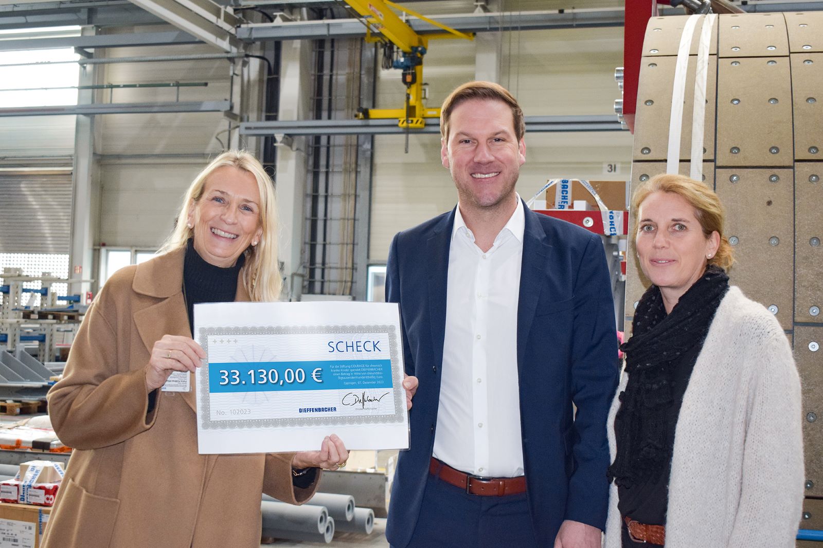 “On behalf of the foundation, I would like to thank DIEFFENBACHER for the donation initiative,” said Petra Köllner-Kleinemeier, Chairwoman of the COURAGE Foundation, during the check presentation on December 7, 2023 at the company’s headquarters in Eppingen, Germany. “I will pass on these thanks to our anniversary guests straight away,” added Dieffenbacher. “We didn’t expect to raise such a large sum of money. Once again, many thanks to all the donors.”